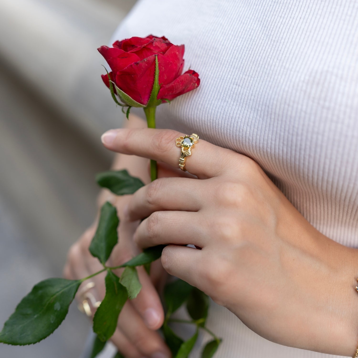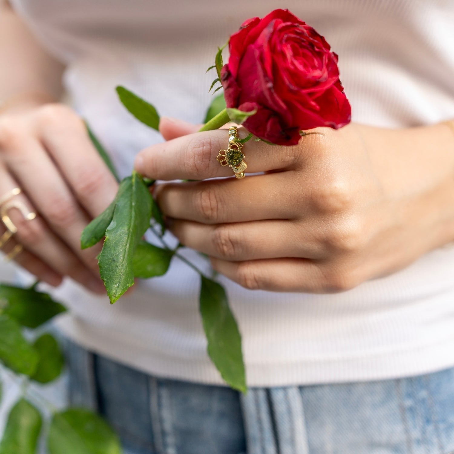 Experience the magic of the Irish with our Sterling Silver Irish Mystic Green Claddagh Ring. Crafted with love and sincerity, this ring represents loyalty and friendship along with stunning sterling silver and mystical green gemstones. Feel the enchantment in every wear!