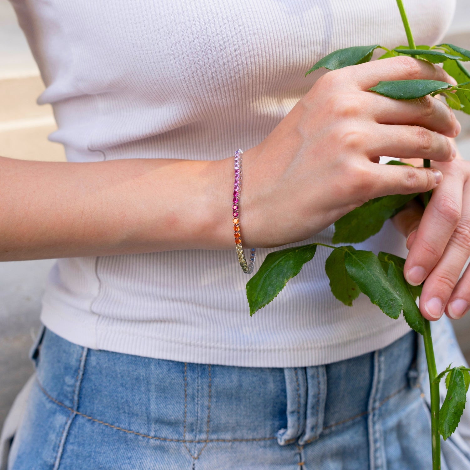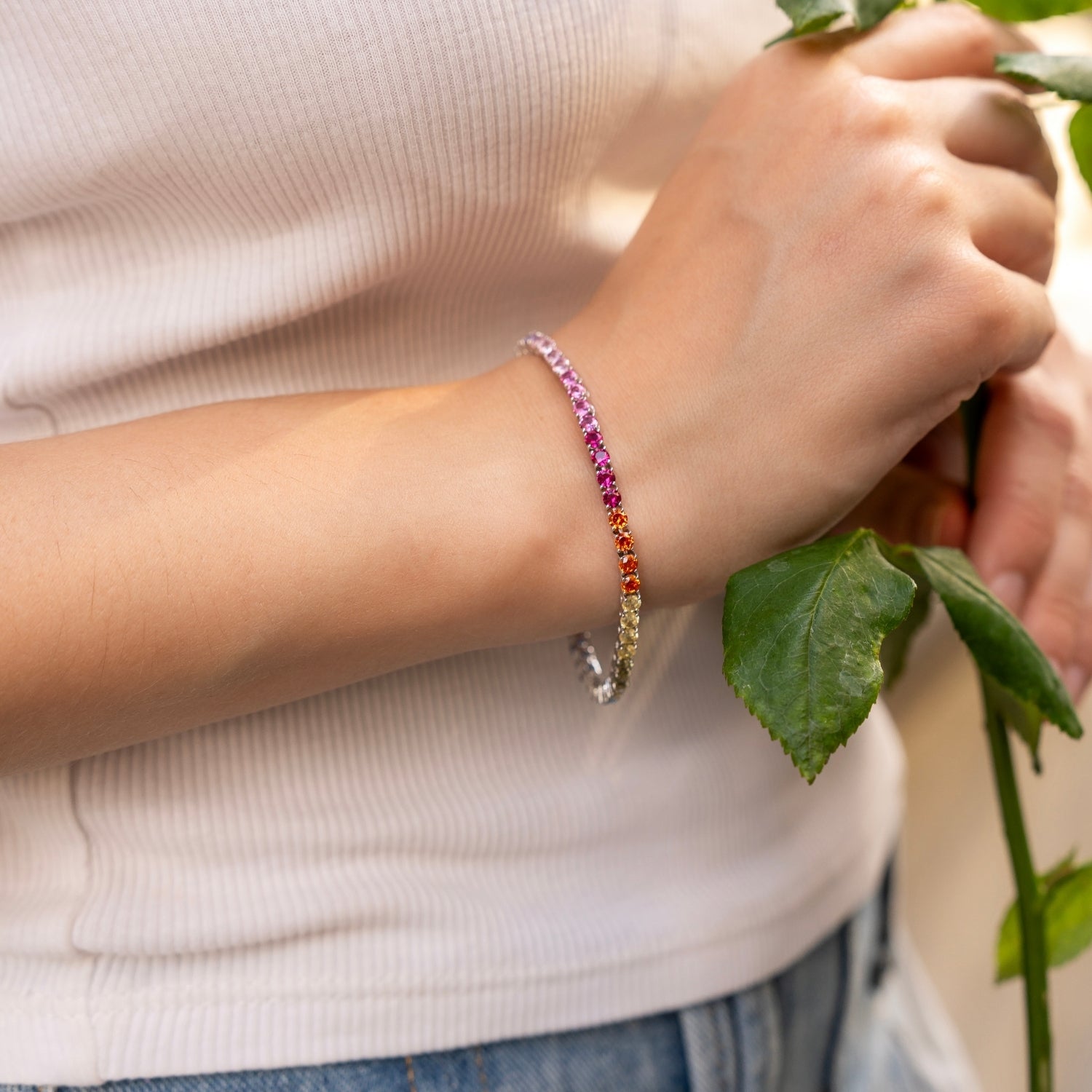 Elevate your jewellery collection with this stunning Sterling Silver Large Rainbow Tennis Bracelet, designed to make a bold statement. Featuring vibrant 3mm gemstones in a captivating rainbow spectrum, each stone catches the light beautifully for maximum sparkle and sophistication. The generous 6.5-inch length ensures a comfortable fit for most wearers, while the premium sterling silver setting provides durability and timeless elegance. Perfect for special occasions or everyday luxury, this eye-catching piece combines colourful gemstone brilliance with classic tennis bracelet styling. A versatile accessory that effortlessly transitions from day to evening wear.