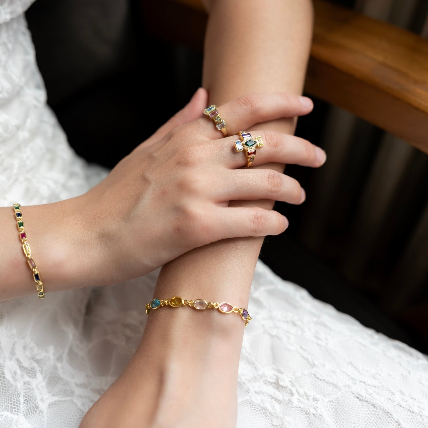 Elevate your jewellery collection with this stunning sterling silver bracelet, featuring vibrant multicolor emerald cut stones set in a striking rectangular design. Each precisely cut gemstone catches the light beautifully, creating a mesmerising play of colour that complements any occasion—from everyday elegance to special celebrations. Crafted from quality sterling silver, this piece offers lasting durability and timeless appeal. The geometric emerald cut stones deliver a sophisticated, modern aesthetic that sets this bracelet apart. Perfect for those who appreciate bold, colourful jewellery that makes a statement without compromising on refinement.